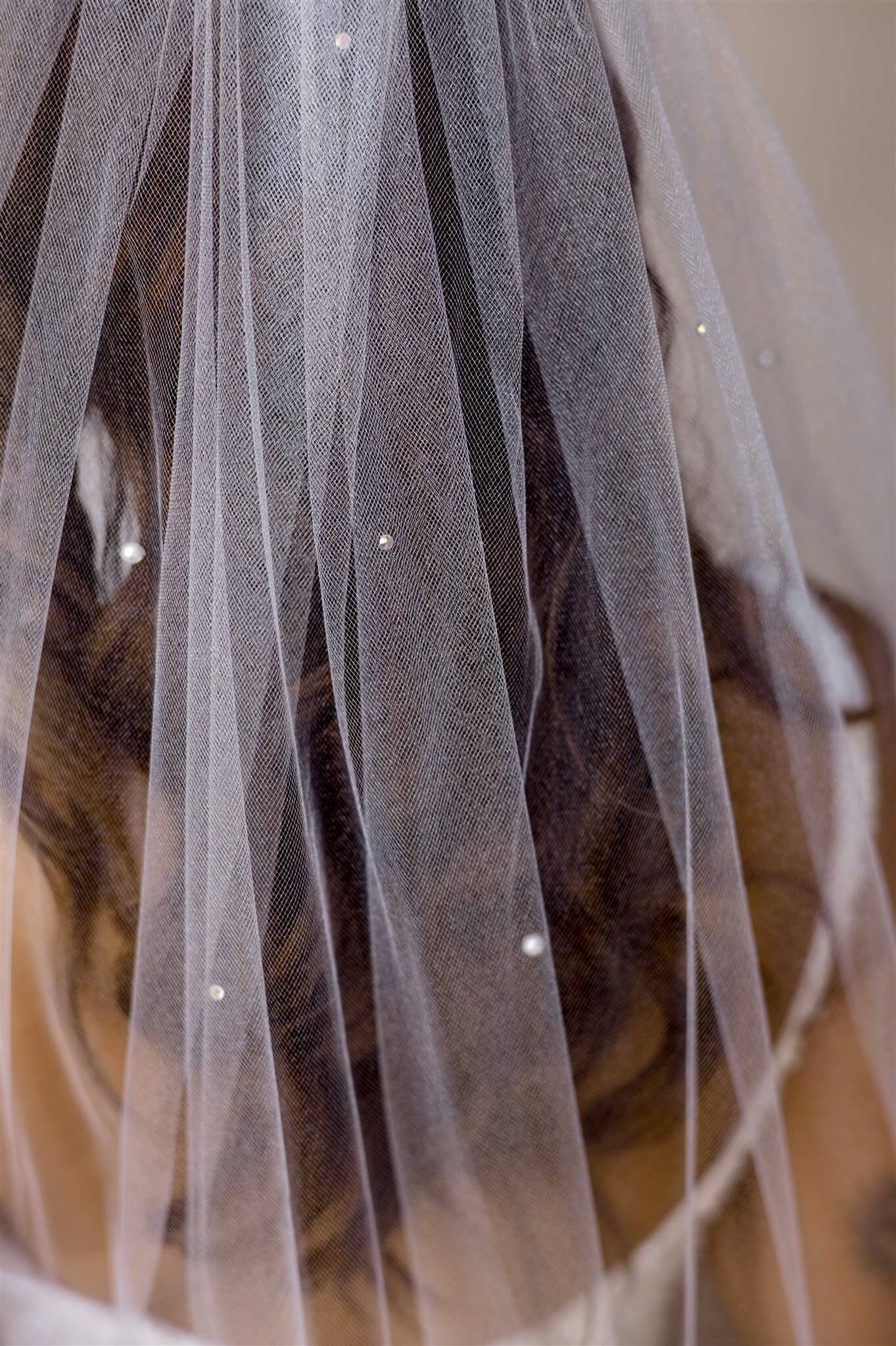 Alexis is a stunning tapered 1 tier cathedral length veil. She is made with our much admired Glimmer Tulle with glued pearls and crystals scattered over the entirety of the veil. The tapered cut allows the comb to have less gathers giving the veil a sleeker look.