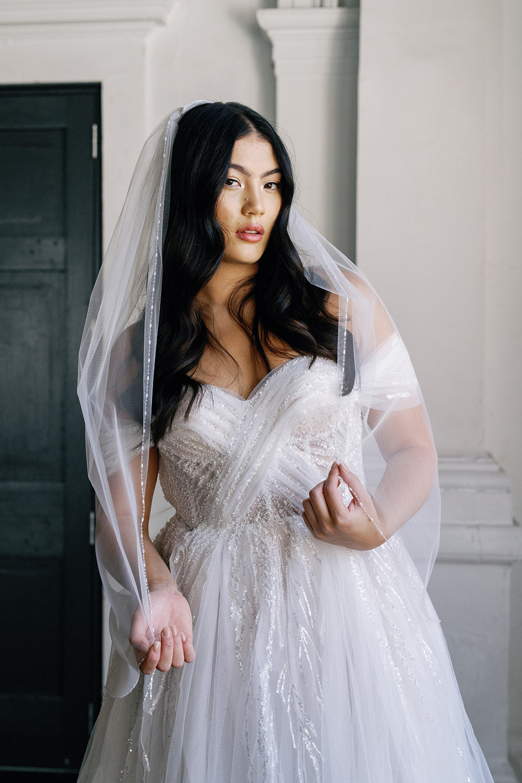 Login to see priceThe Annabel is a gorgeous half width one tier veil. The shape of this veil is gorgeous as it has a small amount of gathers on the comb to provide a bit of volume and isn’t an overwhelming amount of fabric. The edge is adorned with hand beaded pearl beads including three small round beads followed by an oval shaped pearl. This pattern is repeated around the veil to the comb.