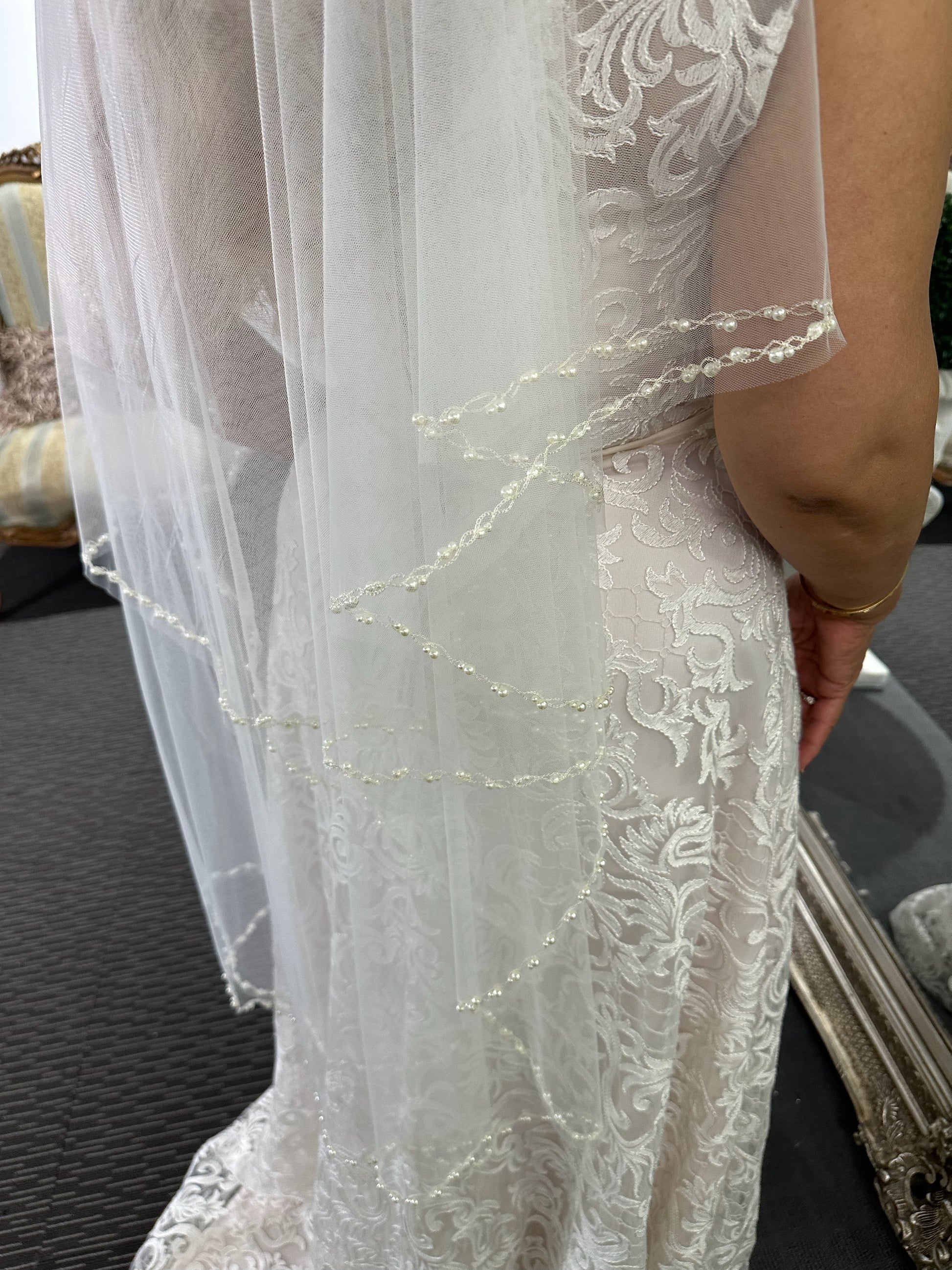 The new design for 2025 Catherine Veil showcases two elegant tiers finished with a distinctive pearl beaded edge with a very fine embroidering detail adding a refined touch to your bridal ensemble. This veil combines classic layering with unique detailing for a sophisticated silhouette, perfect for brides seeking understated elegance with a hint of subtle luxury.
