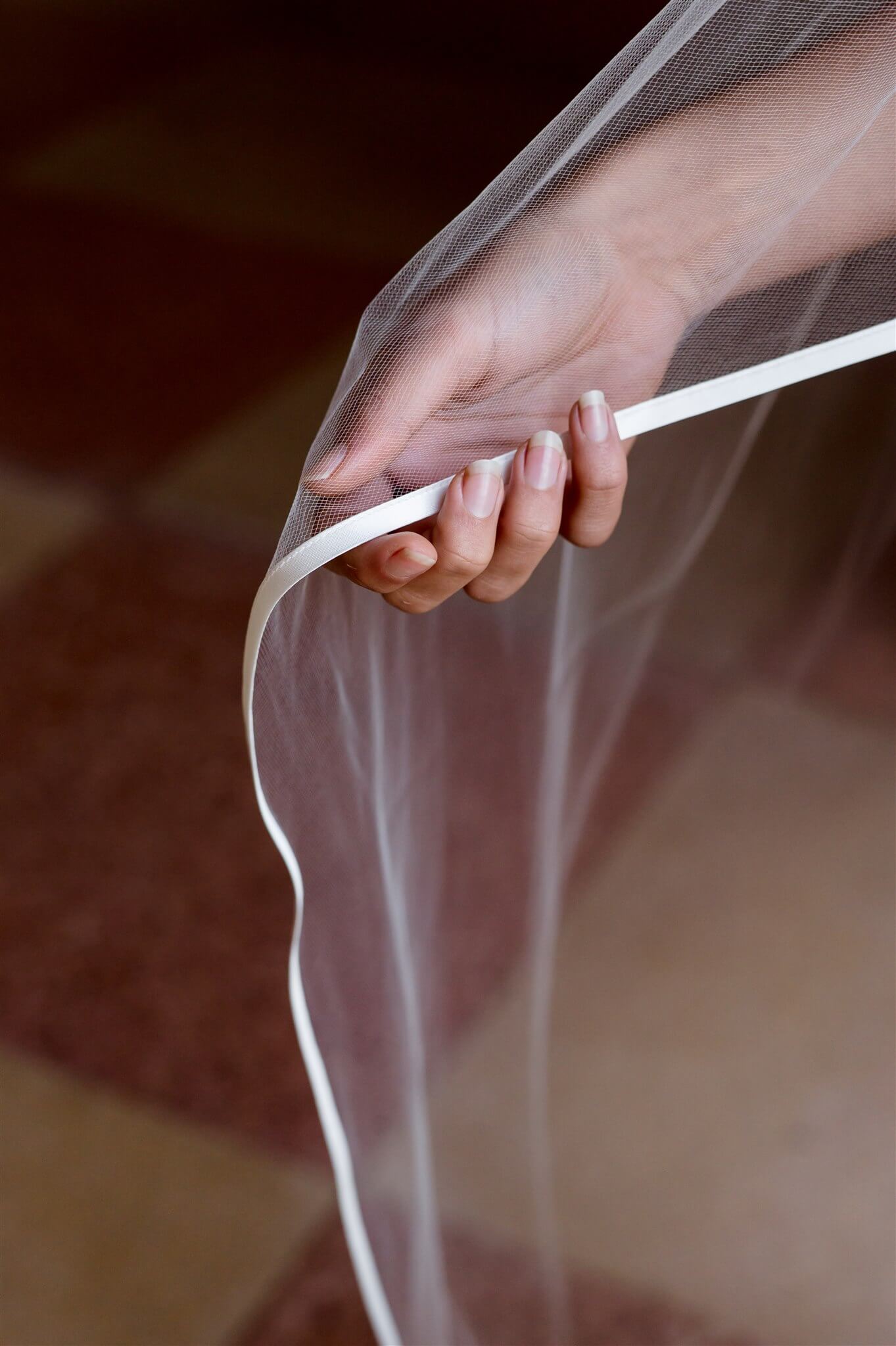 The Celeste veil is a stunning waterfall cut veil on our soft tulle. It is edged in our gorgeous 6mm silk bias binding which allows the beautiful wave look of the veil to be showcased. As a standard it has a longer face veil length and a fingertip second tier, however is also offered in our very popular 1 tier cathedral length.