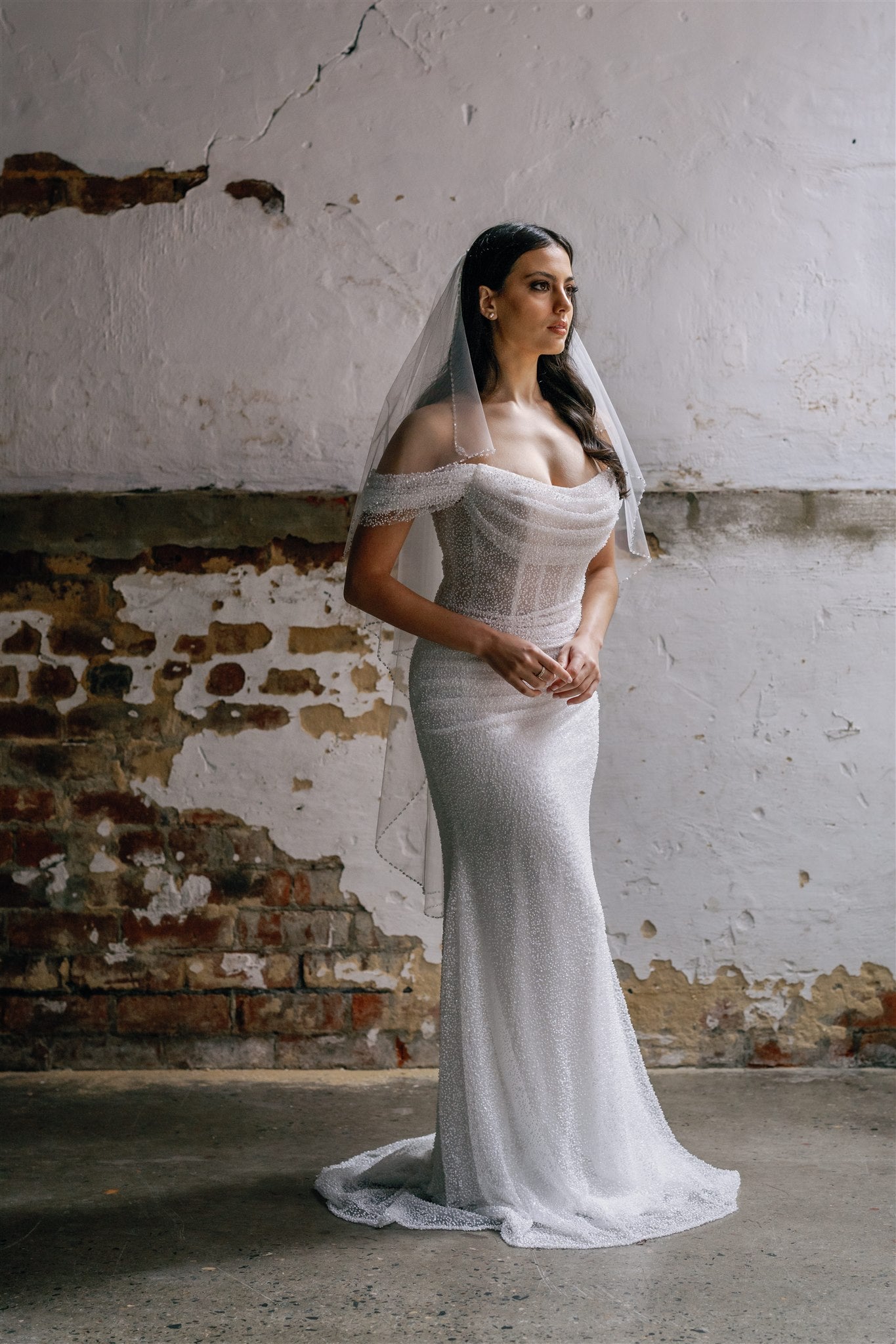 Our gorgeous Cody veil reflects the light just perfectly! We have styled this one as a half width split, but have given the face veil an extra cut to allow the beads to beautifully cascade across the neck line in a beautiful waterfall. Sequins and crystals are lovingly hand beaded around the edge of the veil, with extra embellishments sewn onto the face veil at the points.