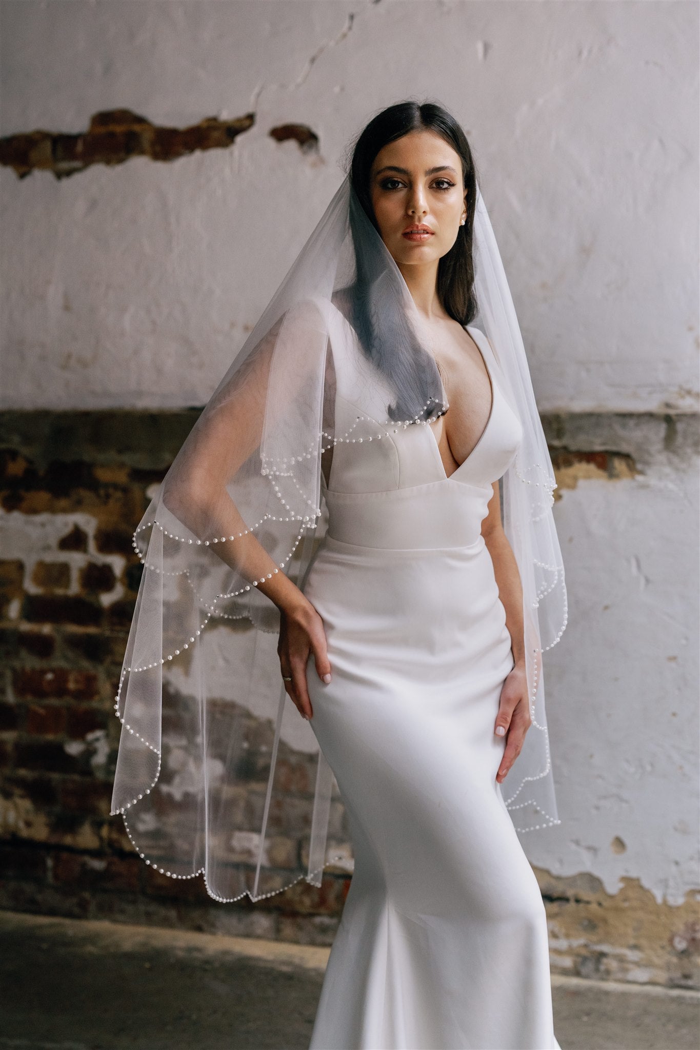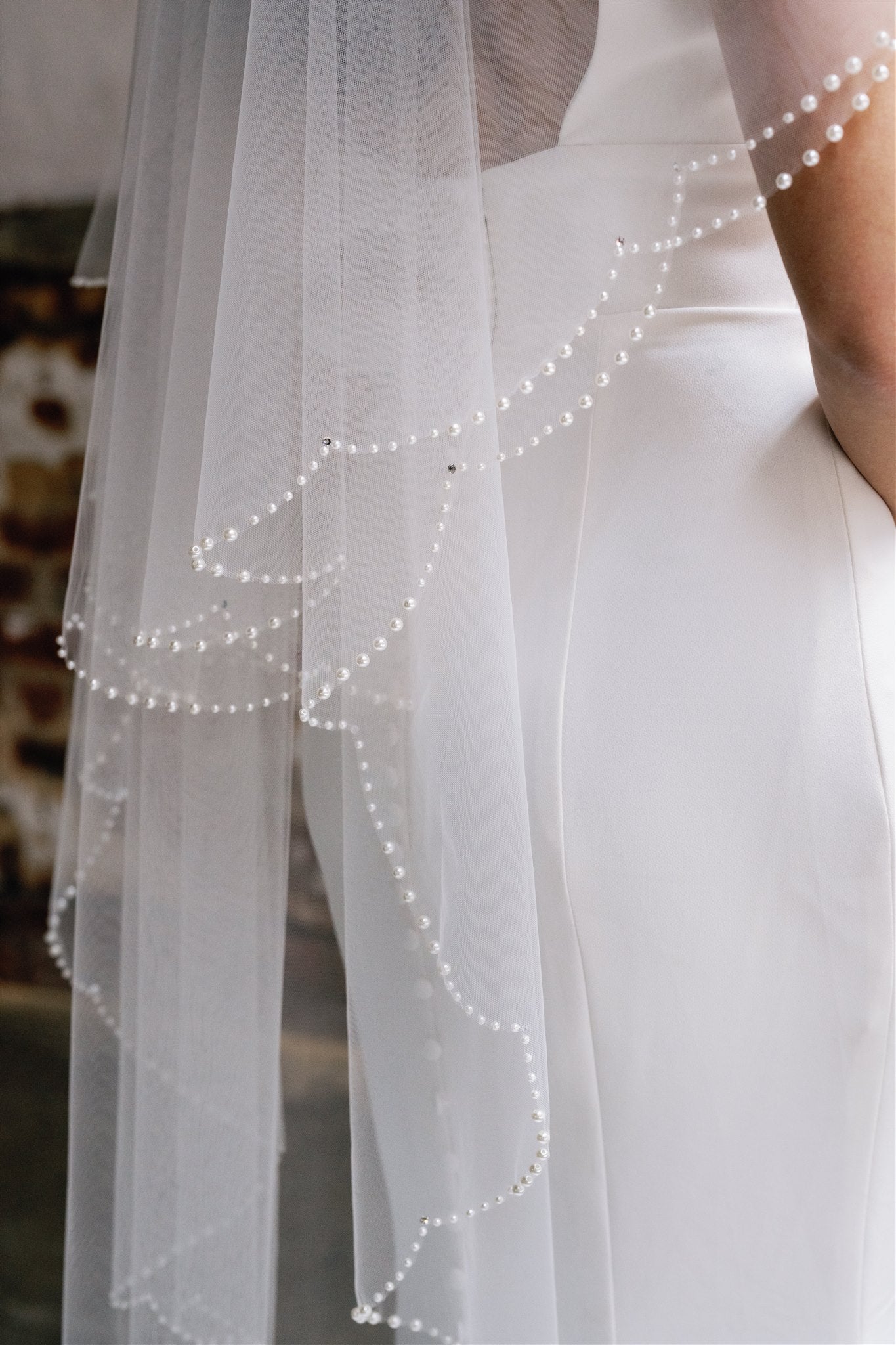 The Drew veil is a stunning scalloped edge two tier veil with pearls graduating in size across the scallop, being complimented by a diamanté where one scallop ends and the new one begins. The same pearl pattern continues around the entirety of the veil.