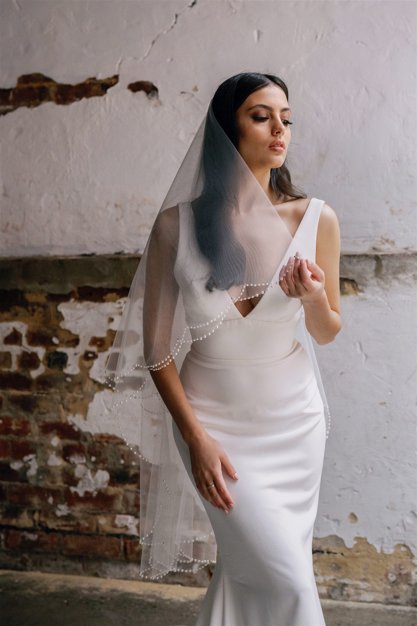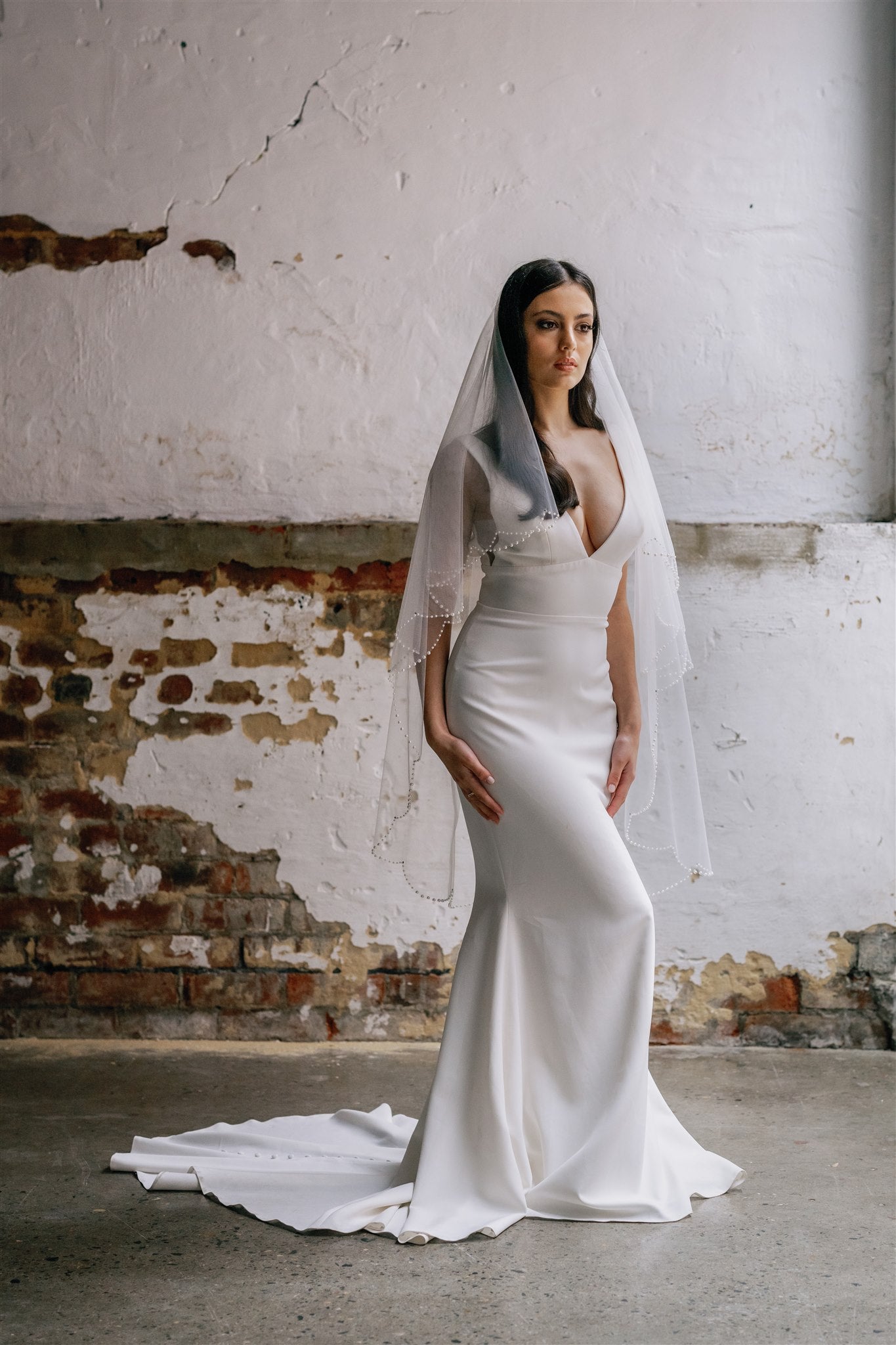 This veil is suited to both a plainer gown or a pearl detail gown.