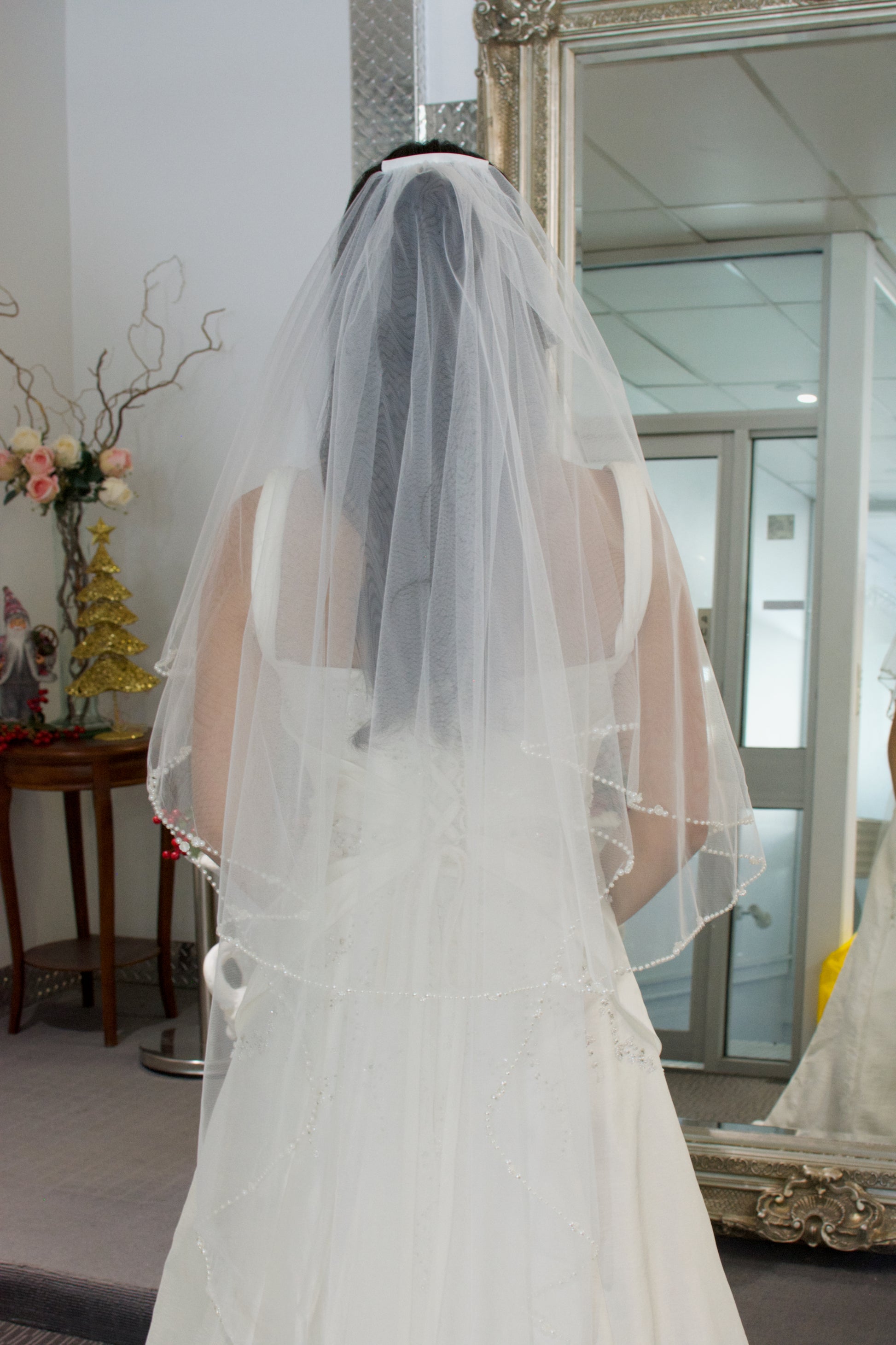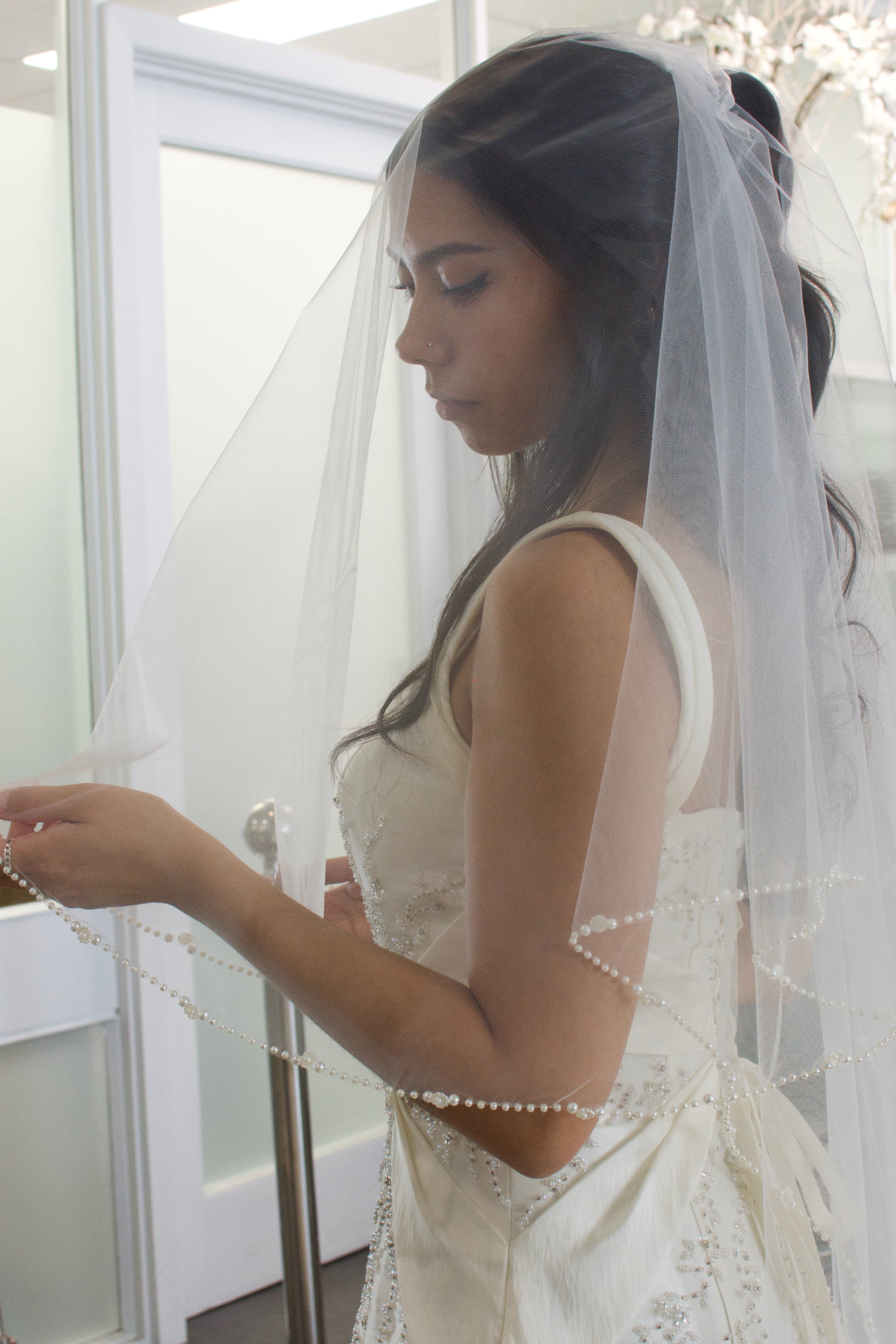 Login to see priceThe Elizabeth Veil features an exquisite pearl edge adorned with delicate pearl flowers that gracefully cascade around the perimeter. The pearls graduate in size, creating a refined and flowing design that enhances any bridal look. Available in both one-tier and two-tier styles, this veil can be crafted to order in all sizes, ensuring a perfect fit for your special day.