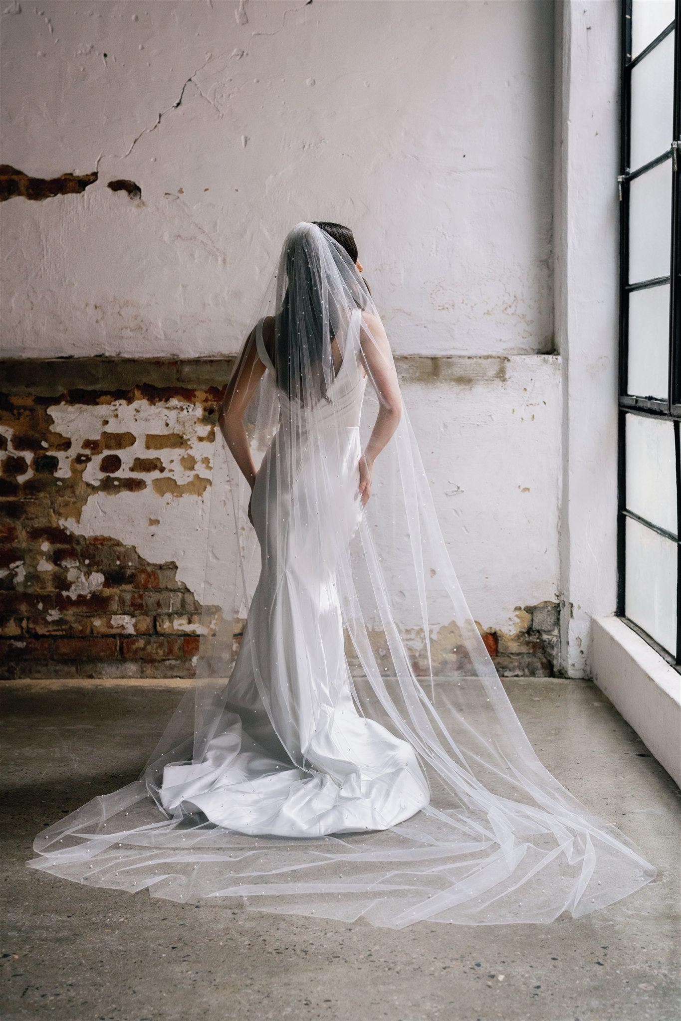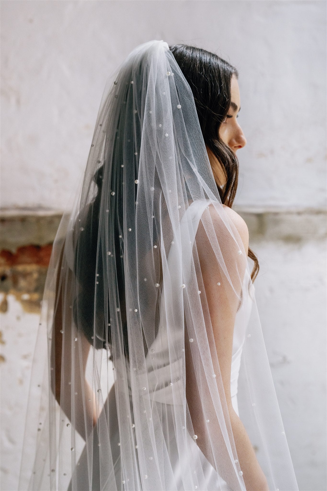 The pearls, strategically placed in varying sizes, bring a sense of depth and dimension to the wedding veil, enhancing its simplicity. A perfect choice for the classic bride seeking an elegant and refined finish to her look.