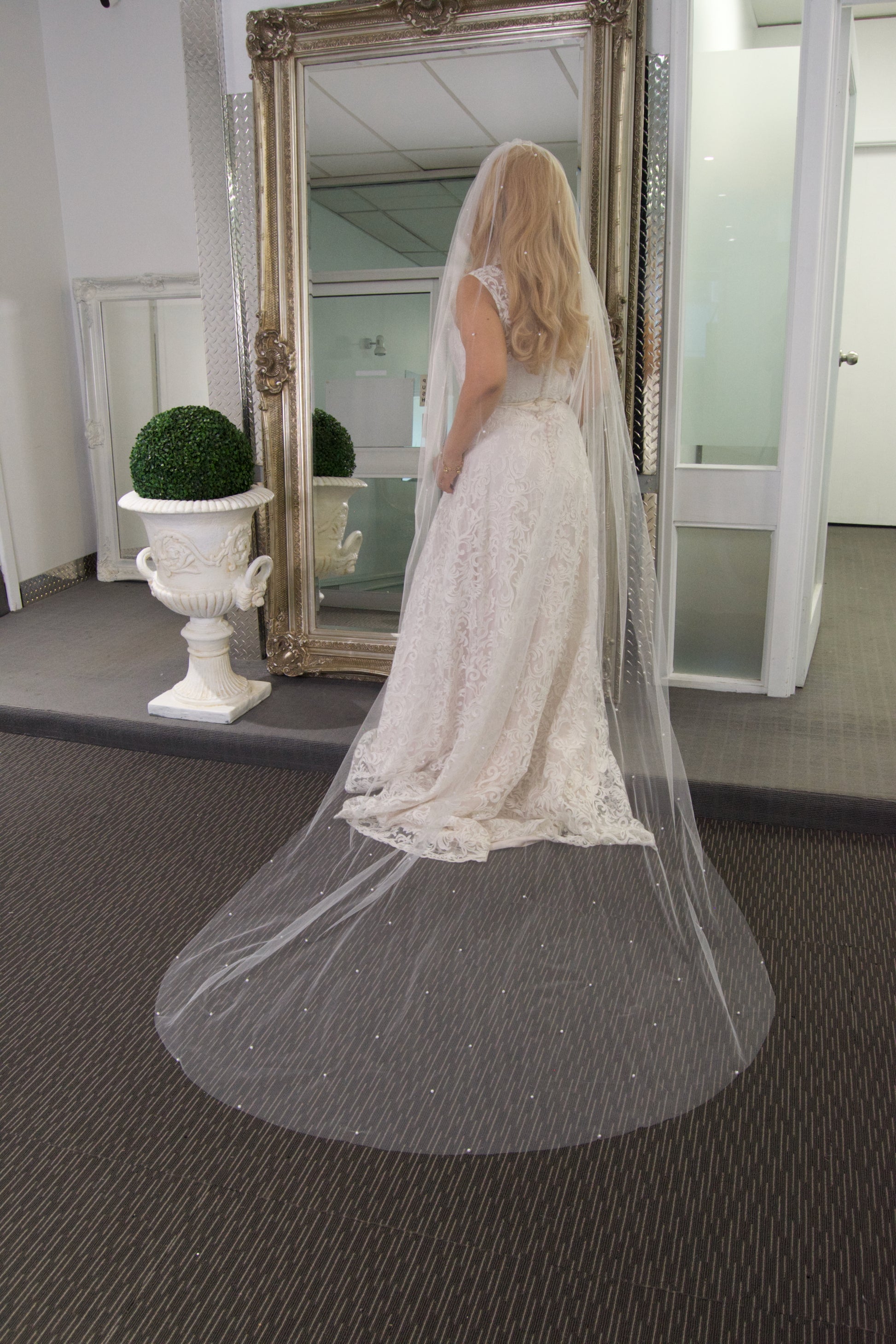 One of our most popular veils Lola is the perfect Pearl Veil for a modern Bride. Sprinkled with pearls about 25 cm apart over all of the veil this gives a dreamy look to it. Not over the top but still a real feature lovely pearls add that luxury touch. The pearls float perfectly on the tulle. Choose from Standard Tulle, Soft Tulle or Glimmer Tulle for a magical effect.