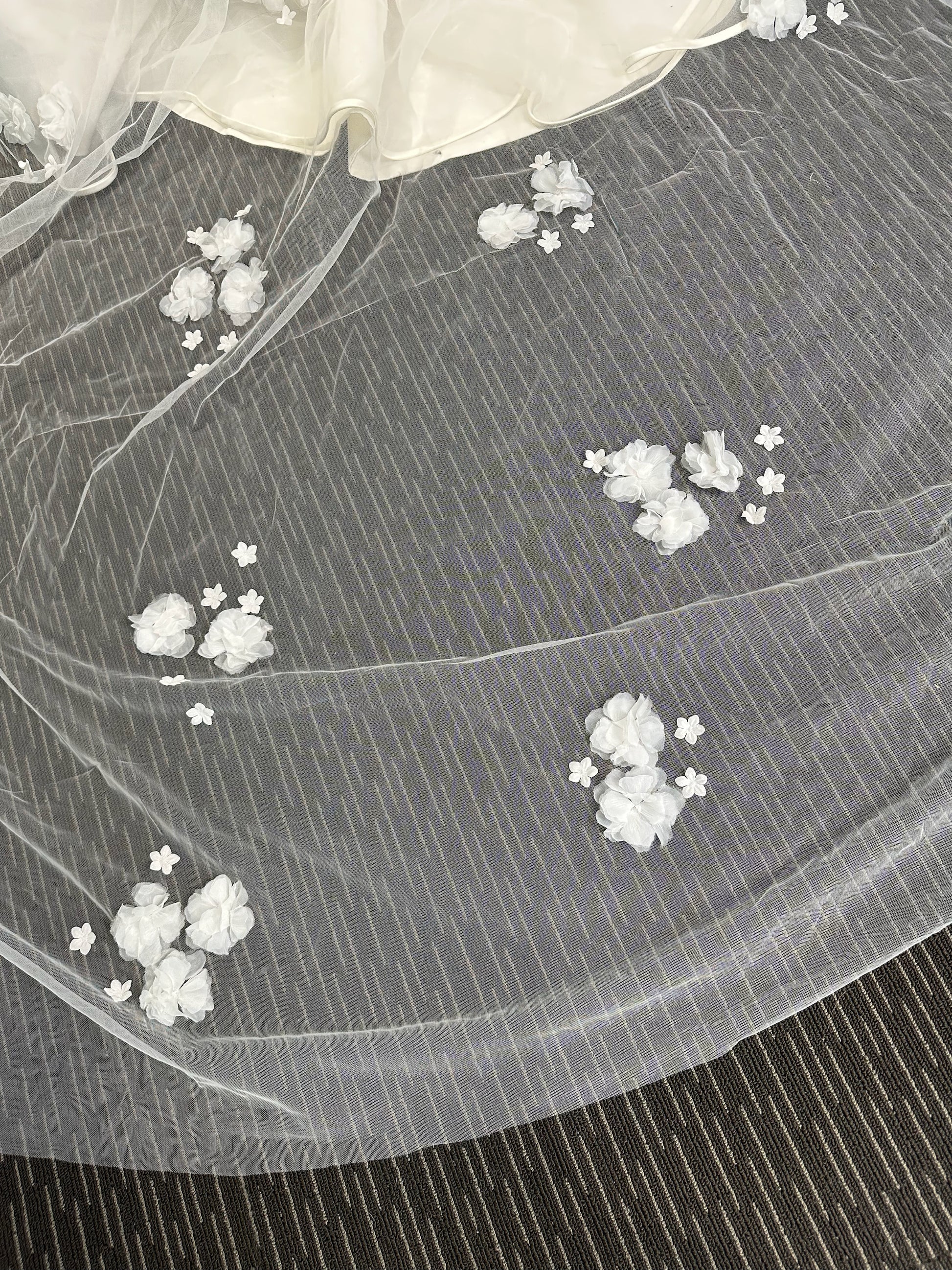 Login to see priceInspired by wildflowers dancing across an open field, this exquisite veil captures nature's delicate beauty. Clusters of hand-sewn tulle flowers are meticulously positioned throughout, creating an organic, flowing aesthetic that moves gracefully with every step. Each bloom is individually crafted, ensuring no two veils are identical. Perfect for the bride seeking understated elegance with artisanal charm, this handmade piece transforms a timeless accessory into wearable art.