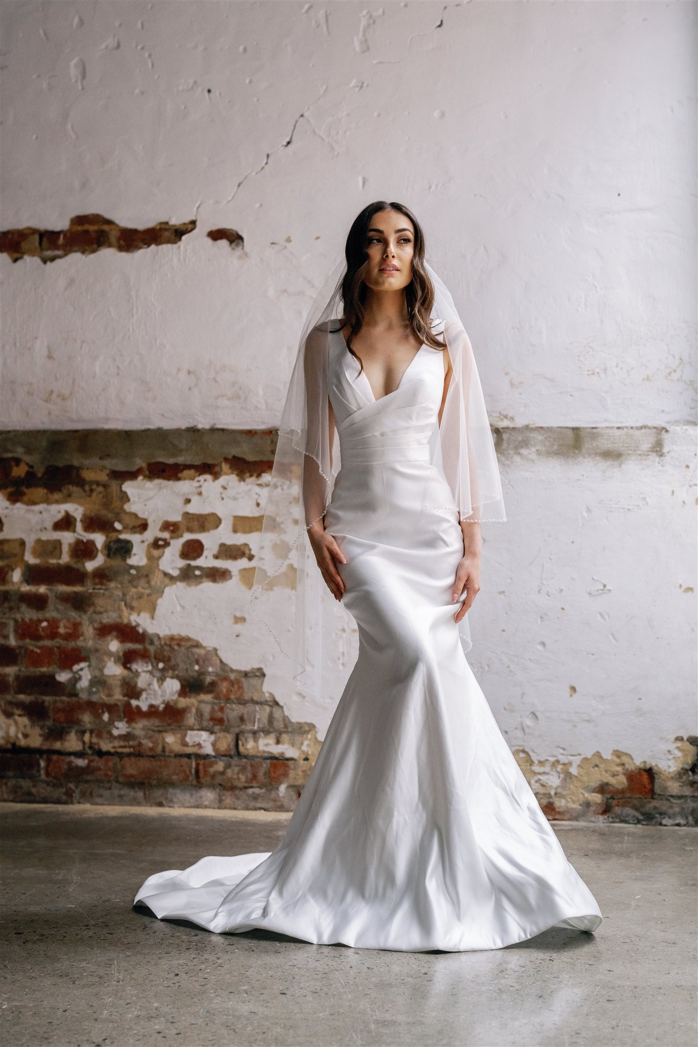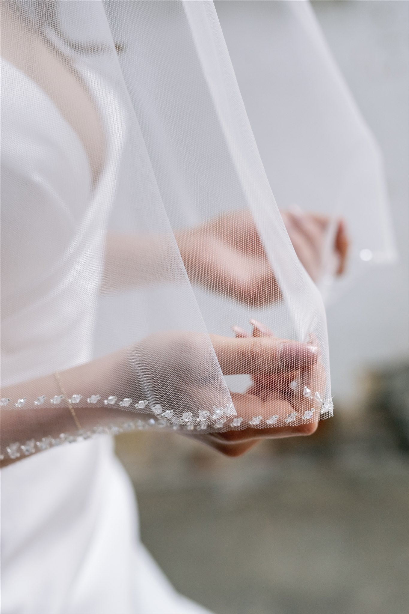 The stunning Morgan veil is a true eye-catcher! We have lovingly hand beaded seed beads and larger crystals on an angle around the entirety of the veil. The way these are placed on an angle brings intrigue to the veil and allows the light to catch it just perfectly!