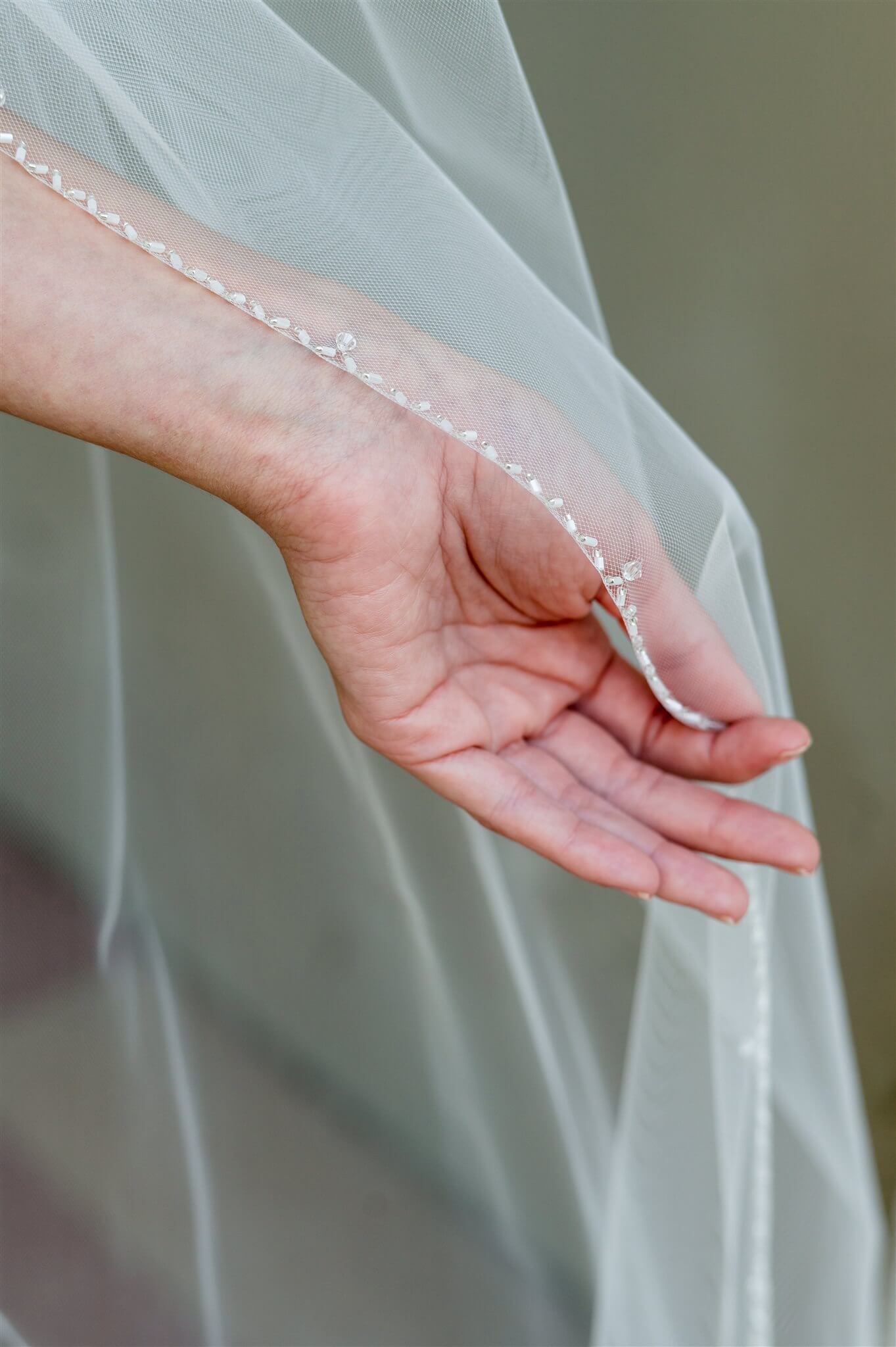 The Sloane veil is a stunning cathedral length one tier veil. Her hand sewn edge is embellished with white bugle beads and silver seed beads in a zig-zag pattern and bicone crystals every few inches.