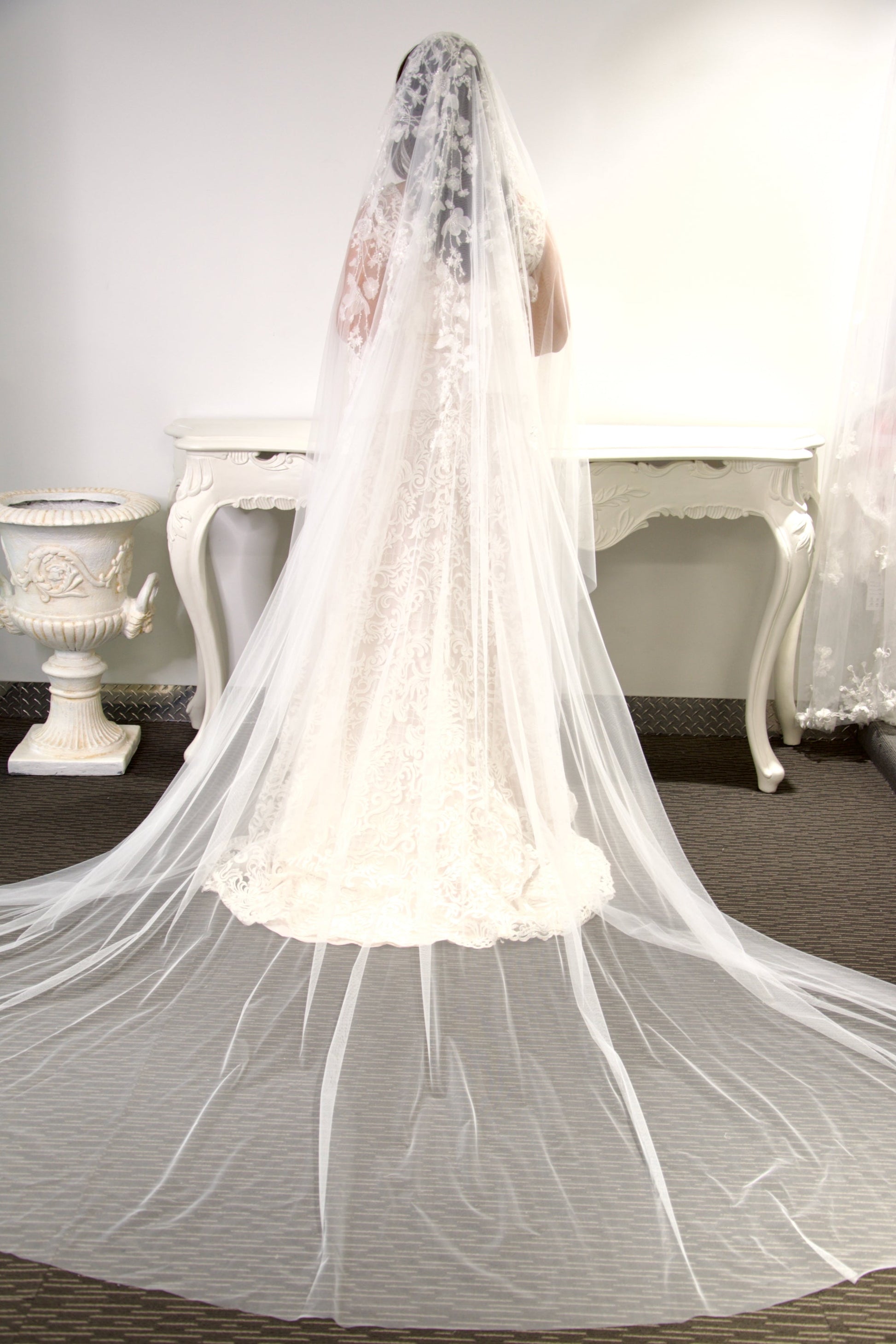 Encrusted by lace flowers and beaded by hand Whitney is a divine modern veil in very soft Solk White tulle this amazing veil adorns your head with love. Cascading down beaded branches of pearls and tiny sequins meet with tulle flowers and gradually flow into the soft fabric of the veil. With a blusher layer of about 27" long (90cm) the main veil is 108" long (275cm)